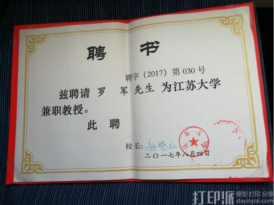 为表彰罗军在推动我国3D打印产业发展所做出的积极贡献,江苏大学聘请罗军先生为江苏大学兼职教授。