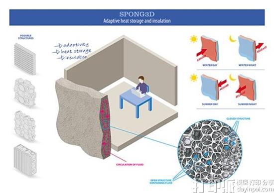 Spong3D可以安装在墙内。由于采用3D打印,它有一个复杂的结构,该结构有隔热和储热功能。各种尺寸的中央空气腔提供了必要的隔绝,而一种可移动的液体在围绕着外边缘的一系列通道中流动,可以在需要的时候储存热量。