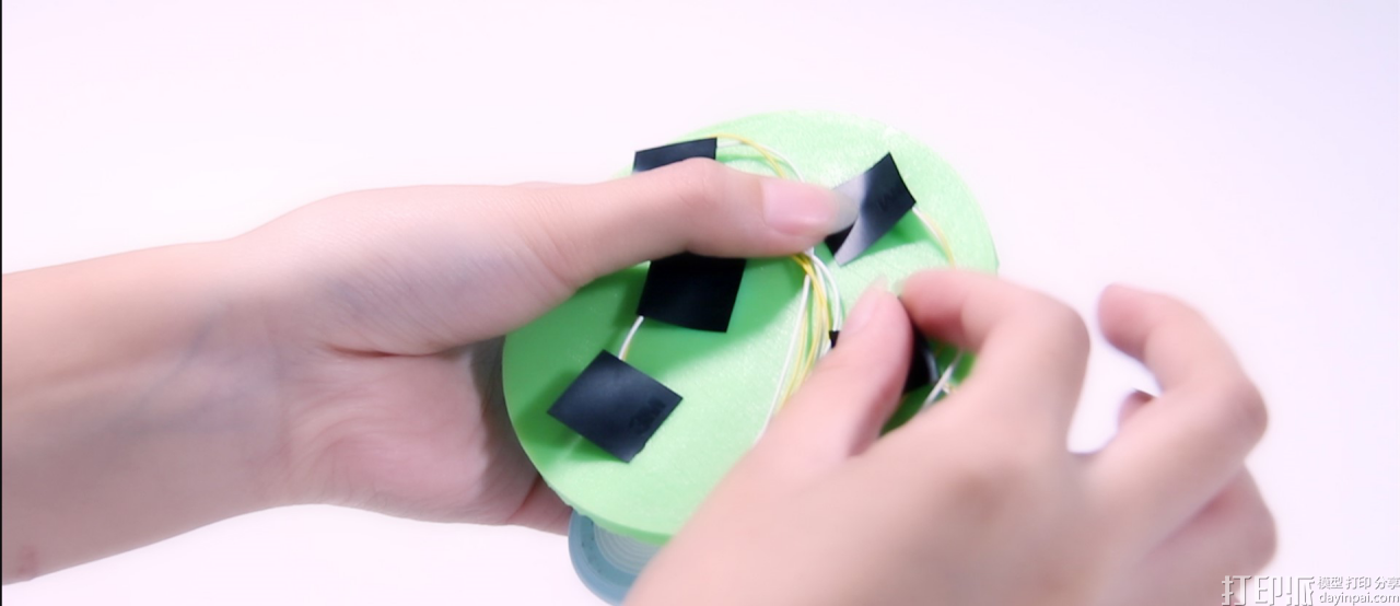 将电池装入电路板,再将灯泡那头依次从草坪孔插入蘑菇罩中,然后用电气绝缘胶将电线粘在草坪底座以固定。