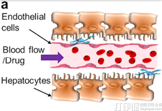 首先,将人类肝脏细胞(HepG2 / C3A)与凝胶结合以制成组织结构。将藻类的墨水排列打印成肝脏中的血管,随后藻类油墨溶解,在凝胶的中心留下中空通道。使用注射器,将脐静脉内皮细胞(HUVEC)泵入中空通道并呈现血管的形状。引进血流时,通道呈现完全血管化的特征。