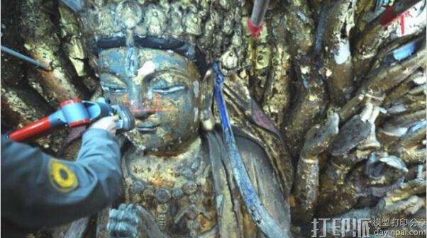 早在2014年,重庆大足石刻景区就已引入3D打印技术修复世界上最大的千手观音像。据大足文物保护工程中心副主任陈卉丽介绍:“通过3D激光扫描获得主尊数据,借助3D打印机按1:3的比例打印出模型,帮助我们科学修复主尊形态的残缺部位,包括头部的倾斜角度、眼部神态等,提供参考作用。”