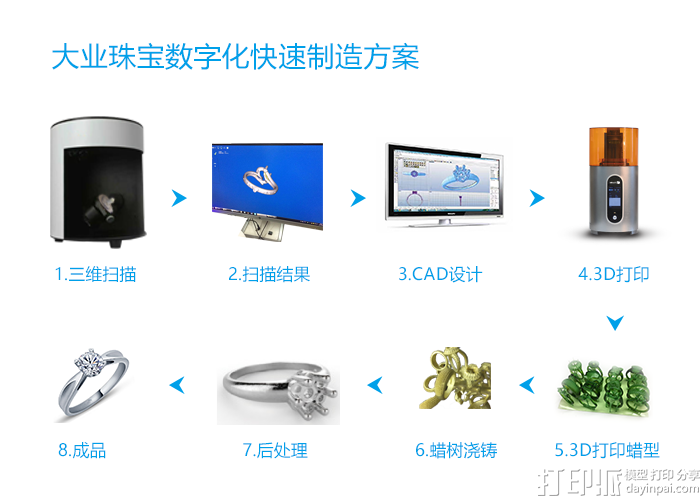 戒指是伟大爱情的见证和象征,每位戒指的主人都希望自己的钻戒“独一无二”,正所谓“定制随心,品位私享”,推动了3D打印在珠宝设计领域的应用。3D打印赋予了珠宝生命、情感、印记,记录着一段美好的爱情!定制化3D打印珠宝设计是一种趋势,正在改变并颠覆珠宝设计行业。同时,大业三维公司同步推出了大业DS130 3D扫描仪和珠宝数字化快速制造方案,如图所示——