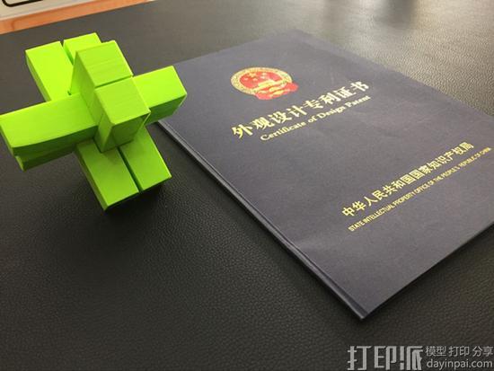 3D打印鲁班锁获得国家知识产权局颁发的外观设计专利证书