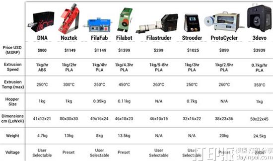 此外,DNA挤出机据称能够以10英尺/分钟的速度挤出细丝,即使在ABS的情况下,也可以在1小时内制作1公斤长丝卷曲。相比之下,Filabot挤出机需要4.3小时来处理1公斤PLA,而ProtoCycler需要2.5小时。两者都比DNA更贵。