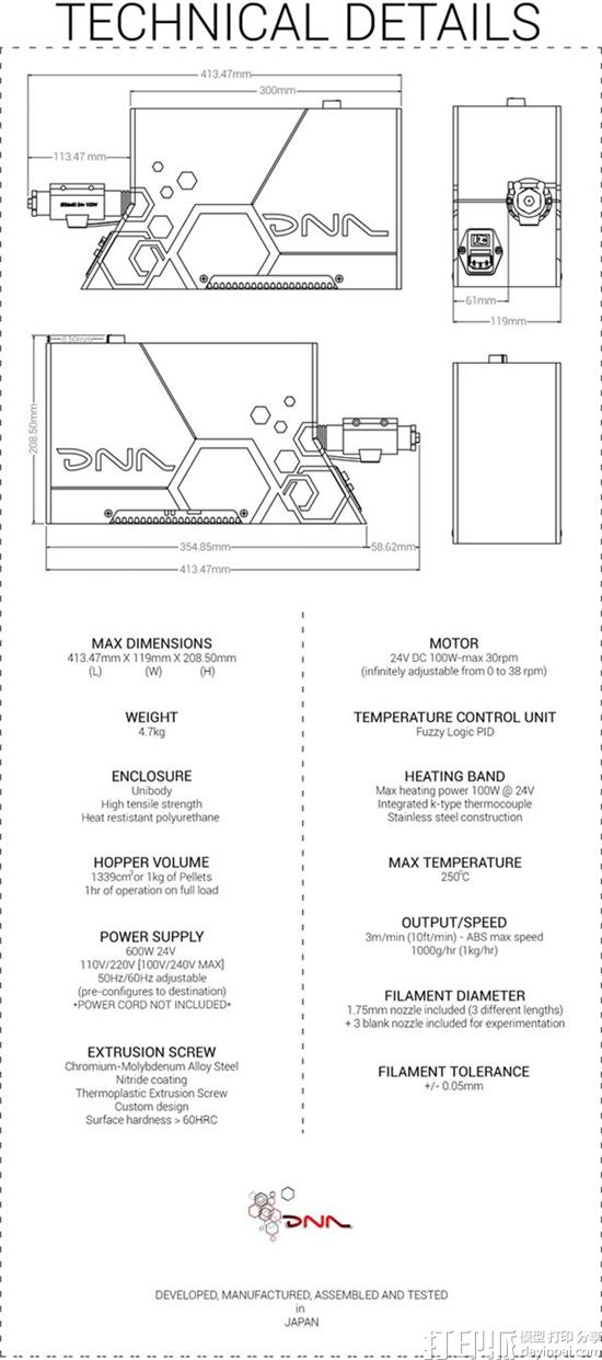 DNA也不需要你手工喂胶。它的大料斗装有一整公斤的小颗粒,意味着一整条细丝可以一次挤出。他们说:“只需加载料斗,并在一小时内安装全新的丝线。不再等待喂食机器,或被小料斗限制。”