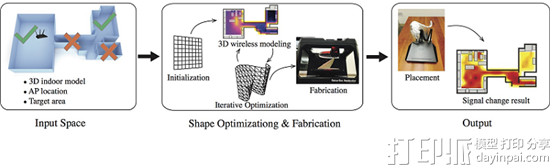 在开发定制的WiFi反射器时,达特茅斯团队创建了一个算法,可以生成一个“瞄准无线覆盖”的反射器形状的3D模型,以及一个模拟WiFi信号如何分散在给定环境中的技术。作为WiPrint技术的代表,该程序能够在23分钟内生成一个“优化的反射器形状”,其中考虑了内部空间中的路由器位置以及信号的目标区域等。