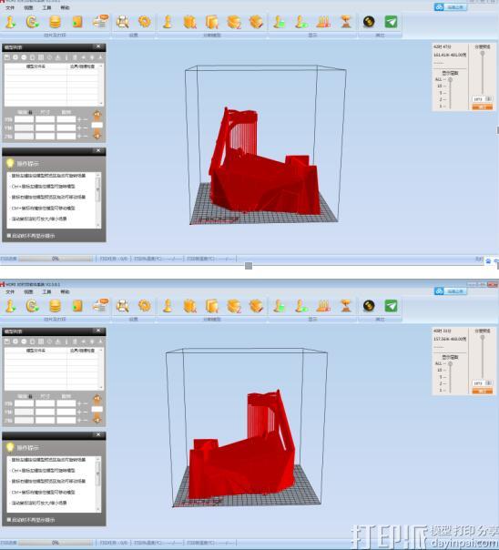 这辆战车同样是由弘瑞3D打印机打印,由于战车尺寸巨大结构复杂,因此工作人员用弘瑞切片软件的切割功能将其切割分成多个小块打印,以此来减少打印时间与降低打印和后处理难度。经过切割后的车身将其切割面平整的置于打印机平台上,这样打印的模型可以与平台更牢固地粘接一起,同时减少不必要的支撑结构,既节省材料又能完美地保证车身表面光滑度。模型的打印速度与层高设置等相关参数使用默认参数即可。
