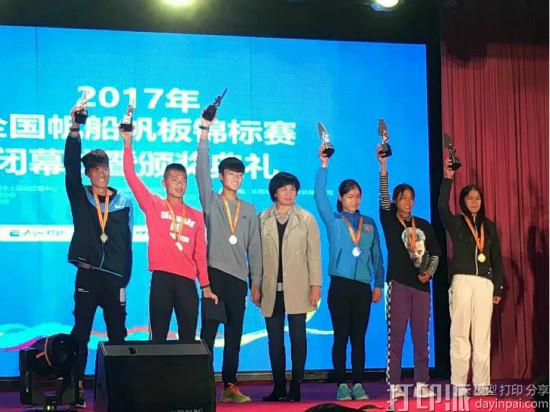 本届帆船帆板锦标赛一大亮点就是奖杯采用3D设计和3D打印制造,金灿灿的冠军奖杯,一只小鲸鱼站在帆板上乘风破浪,非常契合大赛主题。
