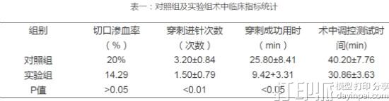 接下来通过比较两组患者穿刺进针次数,穿刺所用时间及术后感染等术后并发症对临床疗效进行评估。结果如表一所示,两组患者均完成手术,无伤口感染,而试验组穿刺进针次数、穿刺成功所用时间及术中调控测试时间显著低于对照组。该研究结果提示,3D打印技术应用于骶神经调控手术的可行性及有效性,为骶神经调控的精准化治疗、个体化治疗提供了方向。