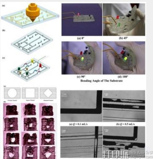 图3.结合流道3D打印与液态金属充注实现柔性电子器件的原理及应用情况