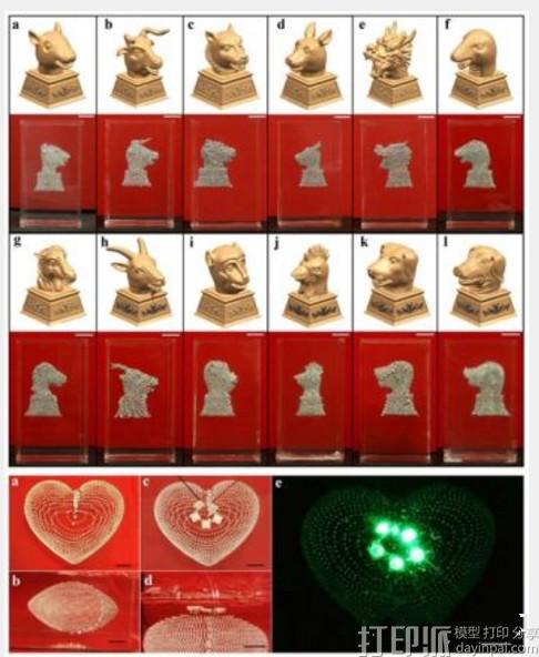 图2.基于液态金属悬浮3D打印原理制成的圆明园十二生肖兽首与立体电路