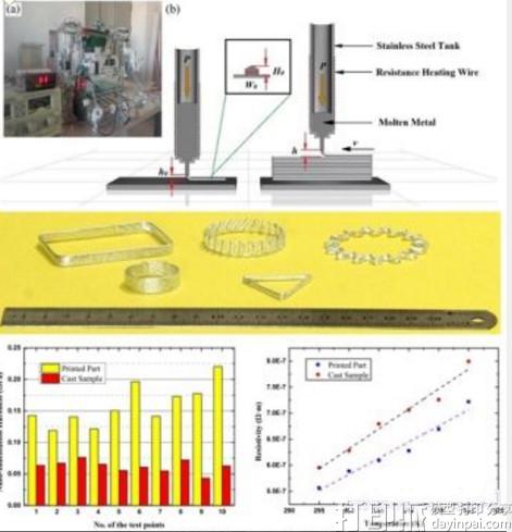 该小组此前发表在Rapid Prototyping Journal上的题为Direct 3D Printing of Low Melting Point Alloy via Adhesion Mechanism的论文中,通过引入一种金属液滴黏附成型机制,展示了利用桌面级3D打印机在室温下直接制造低熔点金属构件的方法(图4)。通过与浇铸零件的机械及电学性能进行对比,揭示出低熔点金属3D打印件在力学与导电行为方面的优势。此技术未来可拓展至基于多喷头的金属、非金属复合打印工艺,实现三维立体电路的一体化成形及封装。