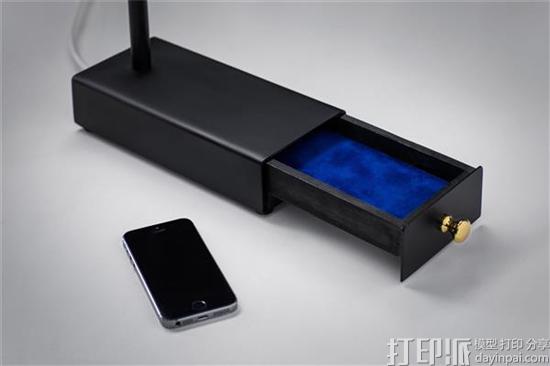 据了解,这款特殊的台灯是由钢制的底座和白色聚酰胺材料3D打印的灯罩组成。它的底座上还带有一个抽屉装置。当接通电路后,用户只有打开抽屉,放入自己的智能手机,就能开启台灯,让它发照射出柔和的灯光。从设计原理上看,它比较像酒店里常见的插卡系统。
