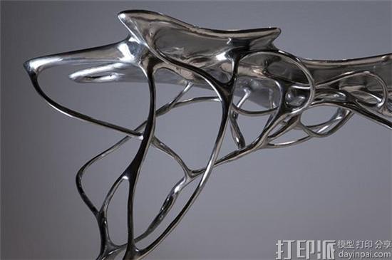 这批被定名为“Growth”系列的家具均采用了抽象式设计。它们由一张81 cm x 140 cm x 66 cm的钛金属桌子,一把42 cm x 82 cm x 64 cm的树脂材料银色椅子,以及一把100 cm x 200 cm x 70 cm的青铜材料的椅子组成。这些充满现代时尚感的家具展示了3D打印技术在家居设计领域的应用潜力,正是该技术实现了马希亚斯天马行空的创意。