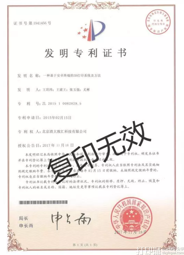 近日,北京清大致汇科技有限公司(O.ME 3D打印)自主研发的“一种基于安卓终端的3D打印系统及方法” 发明专利获得国家知识产权局正式授权,专利号为ZL 2015 1 0082829.5,这是对O.ME核心技术的认可,也是对中国3D打印行业急速发展的认可,据悉该智能技术是全球3D打印行业中唯一的一项智能技术,已经达到国际领先水平。
