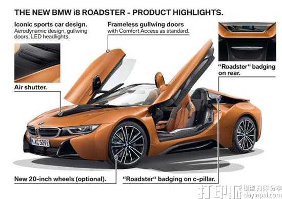 近日,全新的宝马i8 Roadster跑车在洛杉矶车展亮相,它是一款混合动力超级跑车,有着更为充沛的动力以及全新升级的电池。除此之外,全新的颜色搭配、铜制装饰、大量的3D打印金属的加入,都是它的亮点。