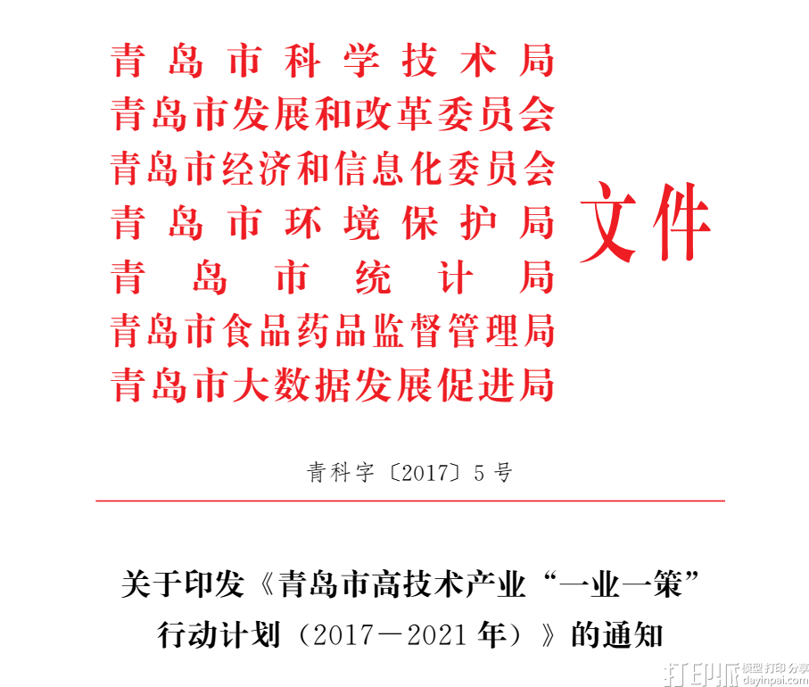 (二)政策支持。全面落实 《促进先进制造业加快发展若干政策》(青政发 〔2017〕4号)、《实施千帆计划加快推进科技型中小企业发展的意见》 (青政发 〔2014〕32号)、《青岛市专利运营引导资金管理暂行办法》 (青科字 〔2016〕9号)等已有政策。做好 《青岛市 “双百千”工程行动计划(2017—2021年)》组织实施工作。重点支持增材制造领域创新设计、专用材料、工艺技术、装备制造、检验检测、数据和服务、标准制定等重点领域发展。企业新增检验检测设备可享受 “首台套”政策。企业采购增材制造设备,参照 “机器换人”补贴政策执行。家电、石化、服装、食品、机械、橡胶、汽车、轨道交通、船舶海工等传统行业企业采购增材制造设备和服务的建议纳入技改贴息政策中。