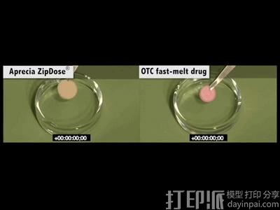 可以看出,Aprecia的3D打印药片只用了不到3秒就几乎完全溶解了,而普通的“速溶”药片直到42秒才溶解了一部分。这不但可以降低患者服药的难度(尤其是对于吞咽困难的老年人来说),而且能让药物更快发挥效果。