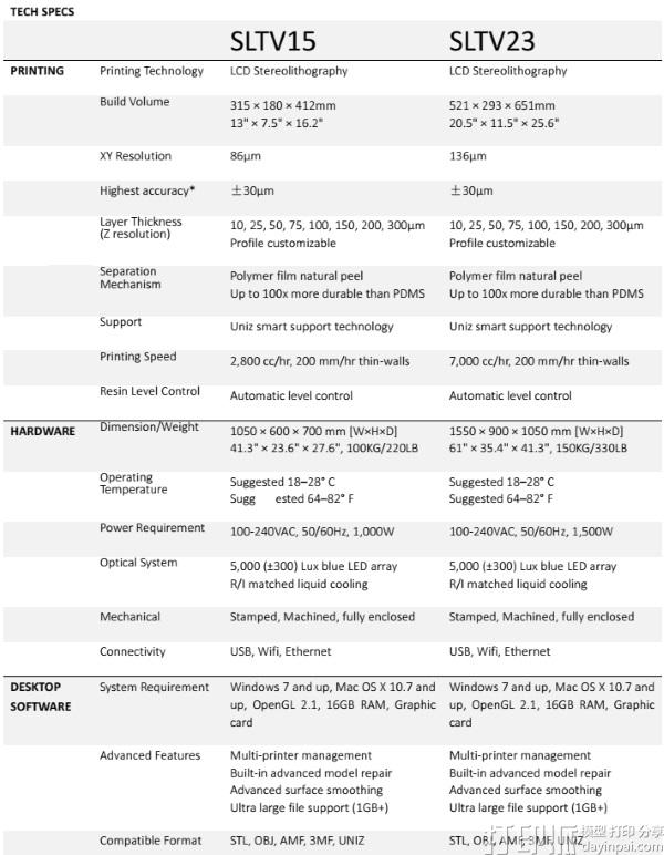 SLTV15的更大版本SLTV23 3D打印机提供147微米的XY分辨率,打印面积为521 x 293 x 650 mm,打印速度高达56,000 cc / hr。 UNIZ声称这使得SLTV23成为有史以来速度最快的SLA 3D打印机。 根据任何人的标准,这使得SLTV23成为一台打印机,可以在未来几个月内保持关注。