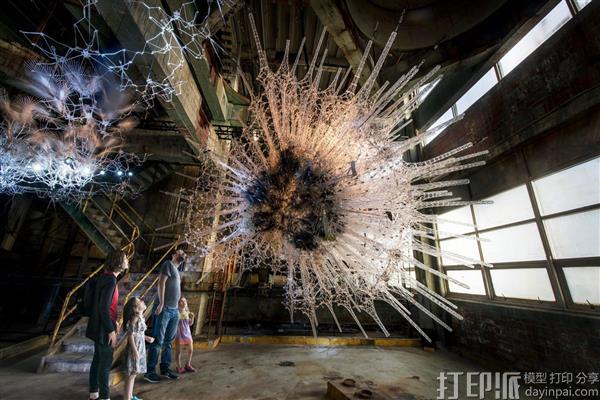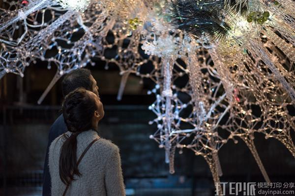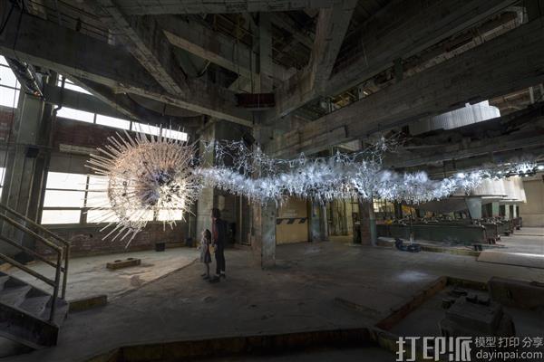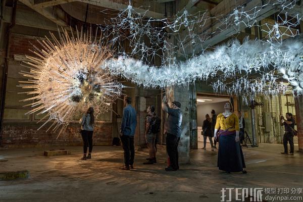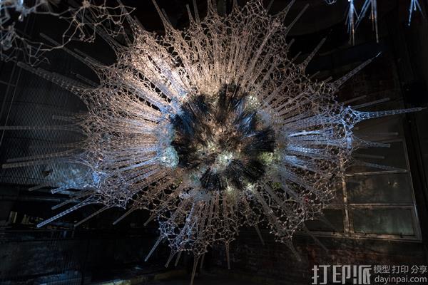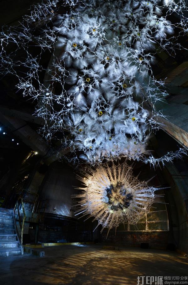 大型结构可以被描述为一种天线脚手架,由大约30万个部件组成 - 其中一些是3D打印的 - 并且集成了许多不同的技术和元素,例如AI特征,响应式音景和化学品。