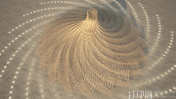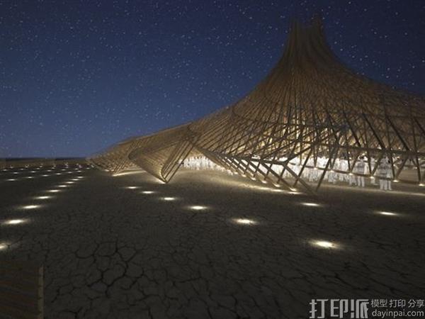 星河庙宇将由20根指向天空中一点的木材桁架组成,并在其中央放置一个3D打印的泪珠,作为寺庙的曼荼罗,是佛教和印度教象征主义中宇宙的一种表现形式。 在这个悬浮的泪珠下面,将是一个在地面的波纹,描绘了泪滴预期的秋天,而木材部分将提供小的壁龛,参加者可以写信息与寺庙焚烧。