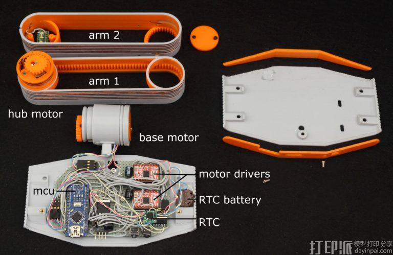 平稳地保持平衡,每个手臂转动一个支点,并由步进电机驱动。电源线通过铜线隐藏,同时仍然允许武器在这个不寻常的形成中移动所需的自由。计时机制本身是由Arduino Nano控制的,除了自定义的gcode发送者之外,编码借用了MarginallyClever的gcode解析器。 3D打印件是在定制的双色Corey机器上制造的。