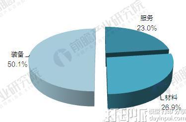 2016年,中国3D打印制造装备、材料和服务的产值比例分别为50.1%、26.9%和23%,材料的占比2015年上升0.2个百分点。