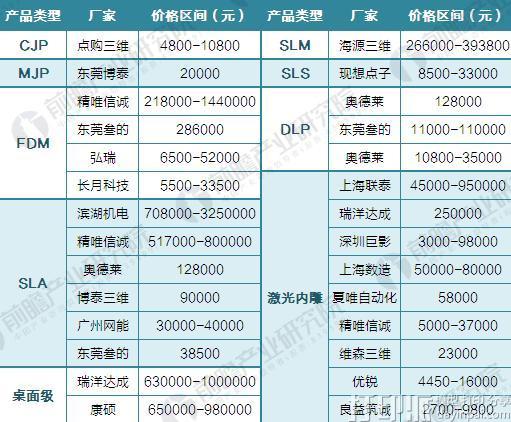 前瞻产业研究院发布的《2018-2023年中国3D打印产业市场需求与投资潜力分析报告》选取了2016年国内比较主要的3D打印厂家中的价格中来分析,从价格来看从最便宜的有2700元的桌面级3D打印机到325万元的SLA工业打印机,价格区间幅度较大,产品层次较多,就算是桌面级3D打印机,青岛瑞洋达成也有100万元的产品,因此下面的价格上来分析,在价格区间1万元至10万元区间段的厂家最多,所以在中低端3D打印机上的竞争最为激烈。