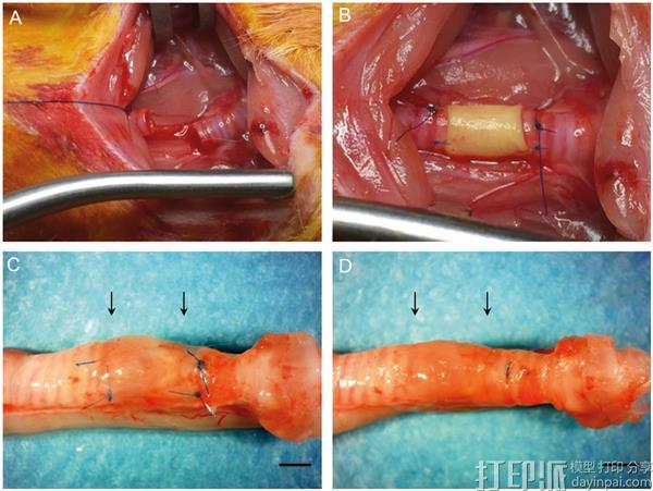 实验中总共使用了9只大鼠,在移植生物打印的气管之后的每一天都仔细检查了23天。在检查过程中,研究人员发现3D打印的气管在用硅胶支架辅助移植时足够坚固,用于防止人造气管的塌陷,并支撑移植物,直到有足够的血液供应。组织学观察软骨形成和血管发生。