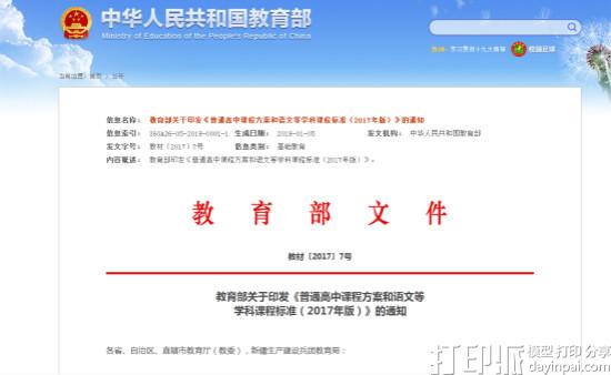 近日,教育部印发《普通高中课程方案和语文等学科课程标准(2017年版)》。在教学内容上,修订后课程重视内容的与时俱进。它将党的十八大、十九大提出的重要思想、重要观点、重大判断、重大举措等,结合各学科的性质和特点,与课程内容有机融合。努力呈现政治、经济、文化、科技等发展的新成就、新成果。在信息技术和通用技术课程要求中,学生将学习了解3D打印、物联网、人工智能、智能家居等新技术,同时还将培养学生的创客精神和创业能力。