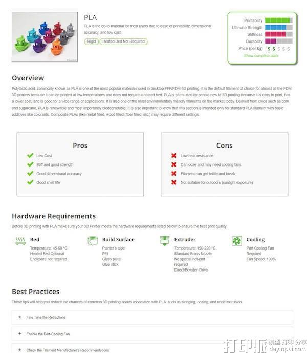 该指南对于制造商来说当然看起来是一个很好的资源,不同印刷材料的并行技术细节特别有价值。 指南中唯一可能引起争议的可能是Simplify3D的“流行品牌”部分,每种材料仅列出5种产品,可能掩盖了较小的独立细丝生产商的工作。