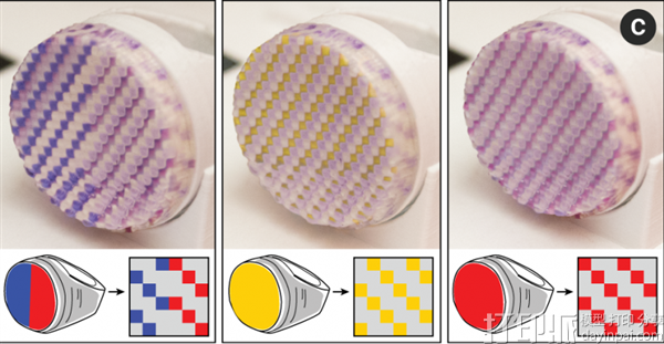 它只适用于团队专门开发的定制油墨,由基础染料,光引发剂和光适应性染料制成。光适应性(光致变色)染料带出了基础染料中的颜色,而光引发剂使得基础染料在3D打印过程中变硬。