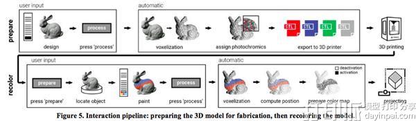 有趣的,但它是如何工作的? Mueller和团队表示,他们的ColorFab过程可以用简单的硬件/软件工作流程进行工作:用户上传3D模型,挑选他们想要的颜色模式,然后打印完全着色的对象。打印后,紫外光可以用来激活所需的颜色,而可见光可以用来关闭其他颜色。紫外线将物体上的像素从透明变为彩色,而常规的办公室投影机将其他像素从彩色变为透明。