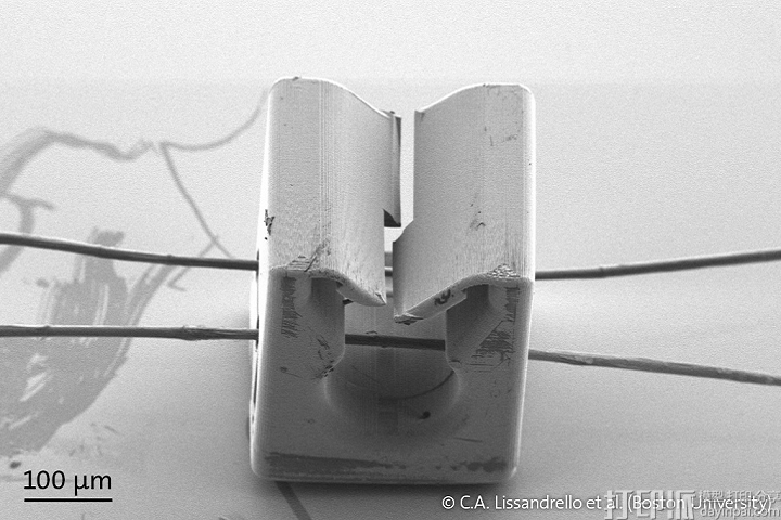 波士顿团队还使用Nanoscribe公司的Photonic Professional GT 3D打印机进行生物电子医学研究,并利用其光刻树脂IP-Dip 3D打印纳米滑块,这种纳米滑块可以围绕不同的电极材料构建; 研究人员在碳纳米管纤维周围建立了他们的微创束缚。
