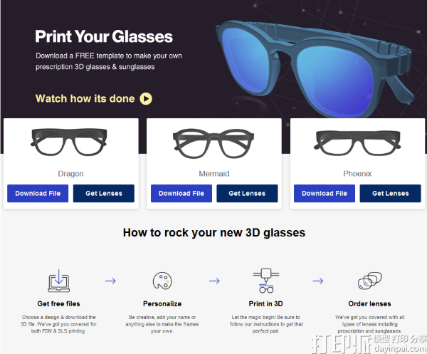 有三个模板可供选择 - 凤凰,美人鱼和龙 - 都是基于品牌最畅销的框架,每一个都有不同的风格:走路者,矩形和圆形,以适应不同的脸型。 消费者可以自定义框架形状, 选择颜色; 添加文字到寺庙,如姓名,电话号码,或鼓舞人心的话最终个性化。 3D帧文件与STL和OBJ格式兼容。