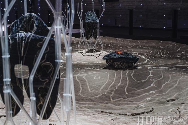 在展览会上,3D打印机器人被放置在一个充满沙子的5×5米地形内,在那里漫游和沉积菌丝体细菌。