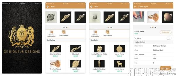 De Rigueur Designs公司推出了3D打印金属珠宝系列,该公司新推出的BEZEL应用程序是一个现场手动追踪增强现实电子商务平台。 最先进的BEZEL平台可让消费者计算并存储其正确的戒指尺寸,并通过移动应用程序购买珠宝,包括戒指,手链和手镯。