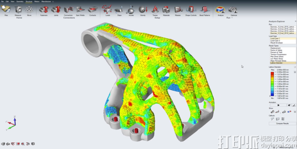 新功能包括生成优化的晶格和混合固体晶格结构,以3D形式显示仿真结果,以及以.stl格式导出晶格设计以进行3D打印。 用户可以查看和交互式地分配加载到加载案例,并使用新的“加载案例表”以.csv文件格式导入/导出设计加载。 他们还可以设计悬臂形状控制的增材制造,帮助减少突出,创造更多的自支撑结构。 用户还可以使用新的PolyNURBS Fit工具自动优化PolyNURBS CAD几何图形与生成设计结果的匹配。