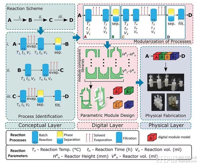 作者将这种设计思路归纳为三个层面进行讨论:首先是概念层,确定反应流程中涉及的化学反应及操作步骤,并设计相应的反应参数;随后是数字层,将以上流程及参数转化为定制的反应模块,并建立3D计算机自动化设计(CAD)模型;最后是物理层,数字化3D模型通过3D打印设备完成实体转化,并实现自动化合成过程。