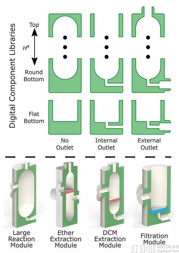确定两种API的反应流程后,他们将相应的组合方案与数字化3D模型建立映射关系,并将其拆分为一系列连续的模块,每个模块可通过3D打印设备打印出单个反应隔室。每个工艺模块创建为数字化模型后还可通过OpenSCAD软件进行适当的优化,从而将反应容器设计成适合反应过程的几何形状。最终作者设计了一个包含18种不同形状反应模块的数据库,每种模块的接口可自由替换并相互衔接。