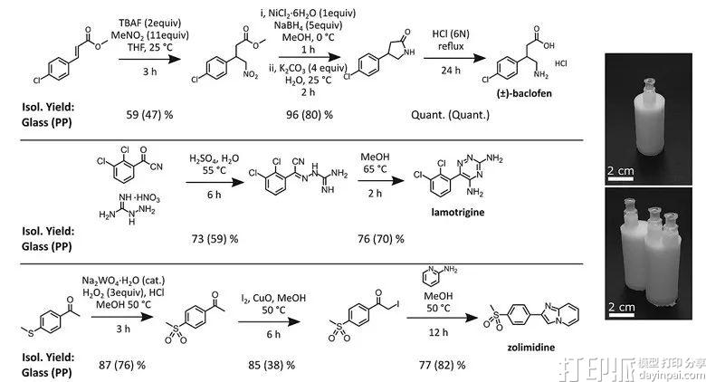 传统的实验室合成过程主要在玻璃容器中进行,作者发现PP材料在有机合成反应中表现出良好的兼容性,同时又是3D打印技术的理想材料,因而选择PP作为制造反应容器的基本结构材料。他们以这种材料制成的反应容器对中枢神经系统抑制剂(±)-巴氯芬、抗惊厥药物拉莫三嗪(lamotrigine)以及抗胃溃疡和反酸药物佐利咪啶(zolimidine)三种API的合成过程进行尝试,前两种API仍可保持十分理想的合成效率,因而用于进一步设计自动化合成过程。