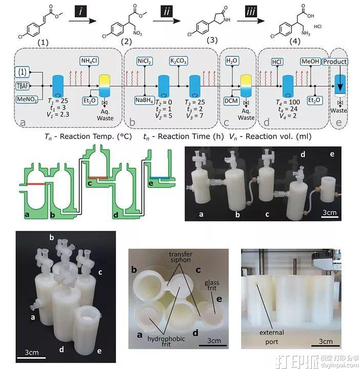 最近,英国格拉斯哥大学的Leroy Cronin教授结合3D打印技术设计了一种可封装聚丙烯(PP)材料的反应容器,并基于数字化程序完成了中枢神经系统抑制剂(±)-巴氯芬(baclofen)的自动化合成。这种设备包含相互贯通的五个不同形状及大小的隔室,整个反应流程涉及3个不同的化学反应及萃取、过滤、蒸发等12个独立的操作步骤。反应装置的设计以及自动化合成过程均通过程序化编码为数字化3D模型,随后借助3D打印设备便可完成以上所有的操作。相关工作发表在 Science上。