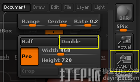 3.因为使用Zapplink插件制作花纹的精度是由画布大小决定的,所以我们要修改画布的大小。在菜单中打开Document界面,点击Duble按钮,然后在zbrush右侧工具栏点击缩放画布按钮。