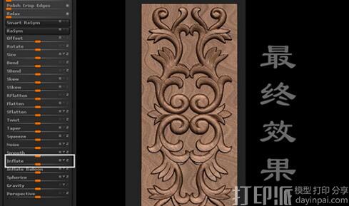 9.然后我们在Tool工具栏找到Deformation菜单下的Inflate,向左或者向右调整这个参数的横杆就可以图案挤压出来了。