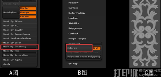 8.接下来我们需要把颜色信息转换为Masking(遮罩)。在Tool工具栏中打开Masking界面,点开Mask By color菜单,点击Mask By intensity(图A),就可以把颜色信息转换为Masking。
