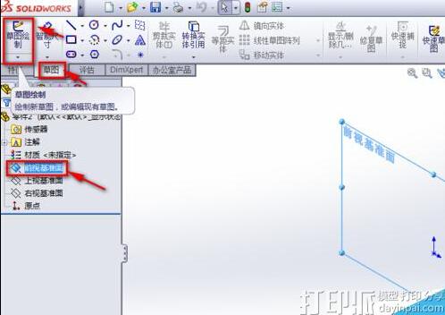 2、选取前视基准面,单击“草图”,选择“草图绘制”按钮,进入草绘界面。以原点为中心,绘制直径为22mm的圆。