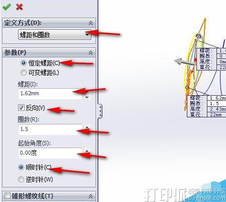 7、选择【插入】-【曲线】-【螺旋线】,在草绘界面左侧出现螺旋线属性管理器。在【定义方式】下拉菜单中选择“螺距和圈数”,在【参数】选项中做如下设置,选择“恒定螺距”,螺距输入1.62,圈数输入1.5,勾选反向复选框,起始角度输入0°,选择顺时针,确定后生成如下螺旋线。