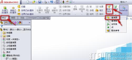 9、单击【特征】,选择【参考几何体】中的【基准面】,选择草绘中的点和边线,生成基准面2。进入草图绘制界面,以原点为中心,绘制直径为1.6mm的圆,退出草图绘制。