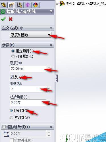 3、选择【插入】-【曲线】-【螺旋线】,在草绘界面左侧出现螺旋线属性管理器。在【定义方式】下拉菜单中选择“高度和圈数”,在【参数】选项中做如下设置,选择“恒定螺距”,高度输入70,选择“反向”,圈数输入7,起始角度输入0°,确定后生成如下螺旋线。