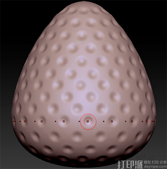 4、在笔刷菜单里,选择Standard Brush,结合配置的Alpha 35和Drag Dot笔触。接下来,在Zsub模式有效的情况下,开始雕刻草莓种子的空洞(如图所示),将笔刷大小和Z强度调整到符合逻辑的大小,交替如图所示的空洞, 比较狭窄的部分,如顶端和底部,依次减少RadialCount值到16、14、12。